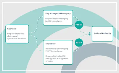 The diagram below shows how regulatory responsibilities are distributed among key stakeholders under FuelEU and EU ETS.