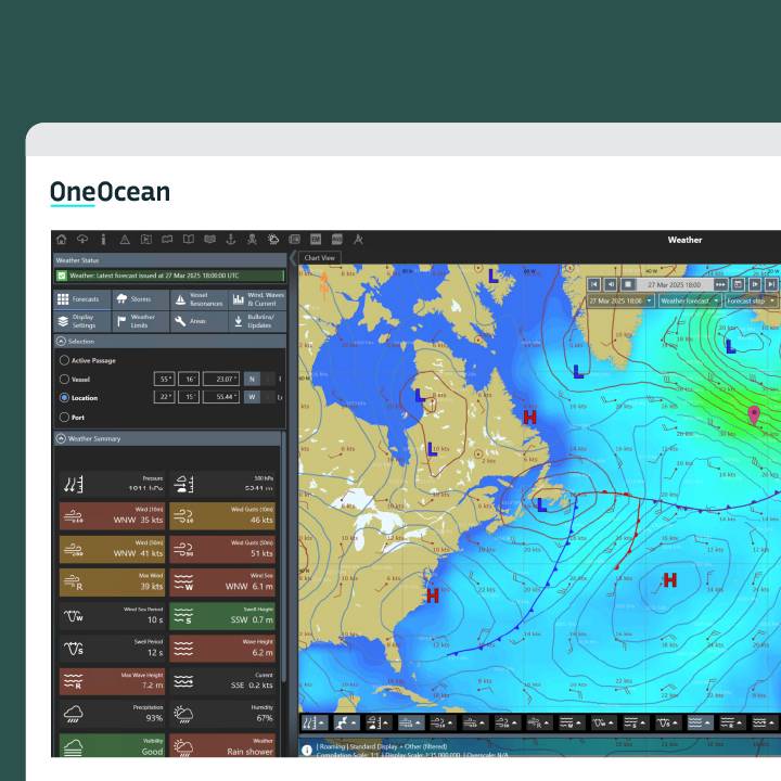 Identify the most efficient route for time, fuel, or cost using the Route Optimisation module. The Weather module also supports decision-making, with detailed forecasts for routes and ports up to nine days in advance, helping crew optimise performance and avoid unsafe conditions.